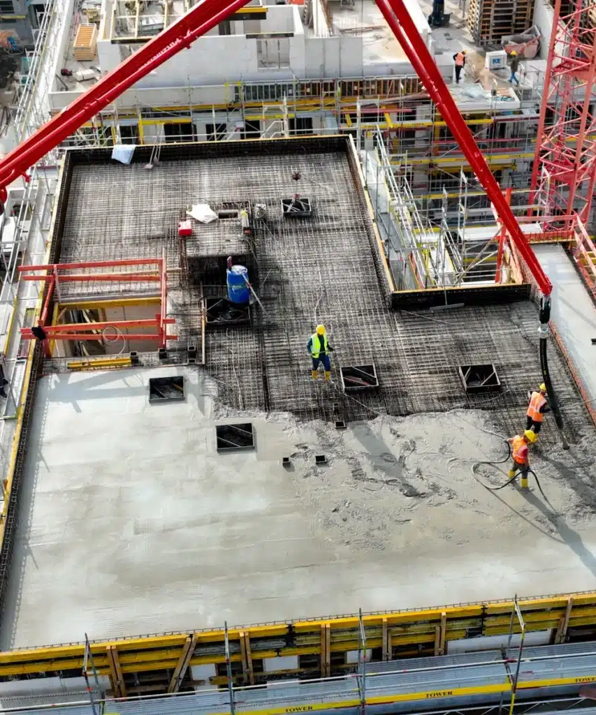 Die geplante Glasfassade mit Holzelementen wird sukzessive eingebaut. Der Umbau der Dachfläche zu einem zukünftigen Gründach erfolgt ebenso planmäßig. Im Innenausbau wird derzeit in allen Gewerken gearbeitet. Parallel wird der Innenhof des Baufeldes weitreichend verändert.