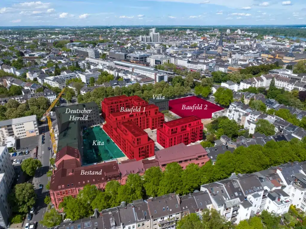 - Der erste Bauabschnitt umfasst das Gelände im Innenbereich zwischen dem «Deutschen Herold» und der «Villa» und wird seit Frühjahr 2020 baulich umgesetzt. Hier entstehen 150 Wohnungen – davon 39 sozial geförderte und 111 frei finanzierte Wohneinheiten.